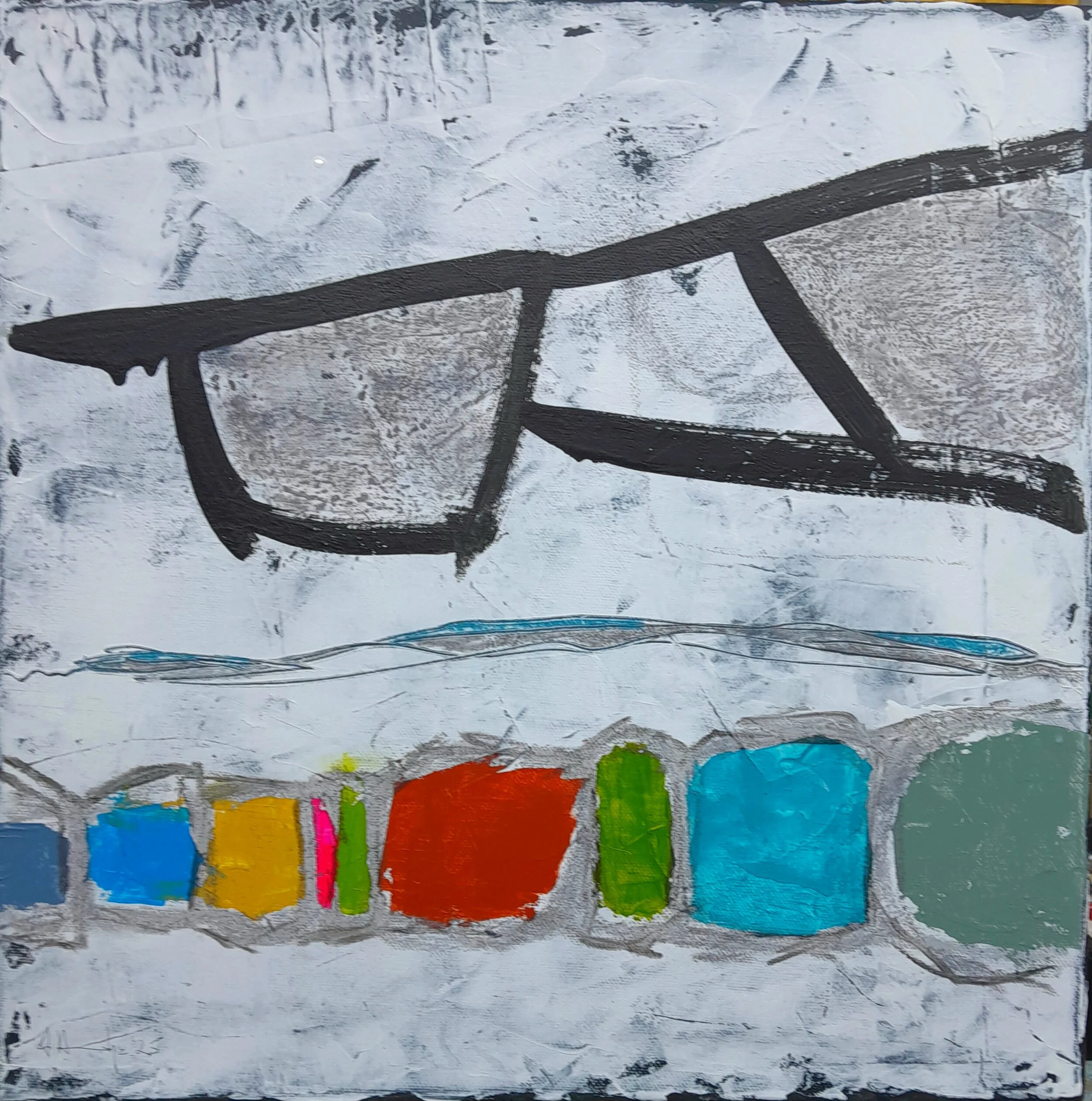 Acrylic, pastel and graphite on stretched canvas. Approx 45x45cm