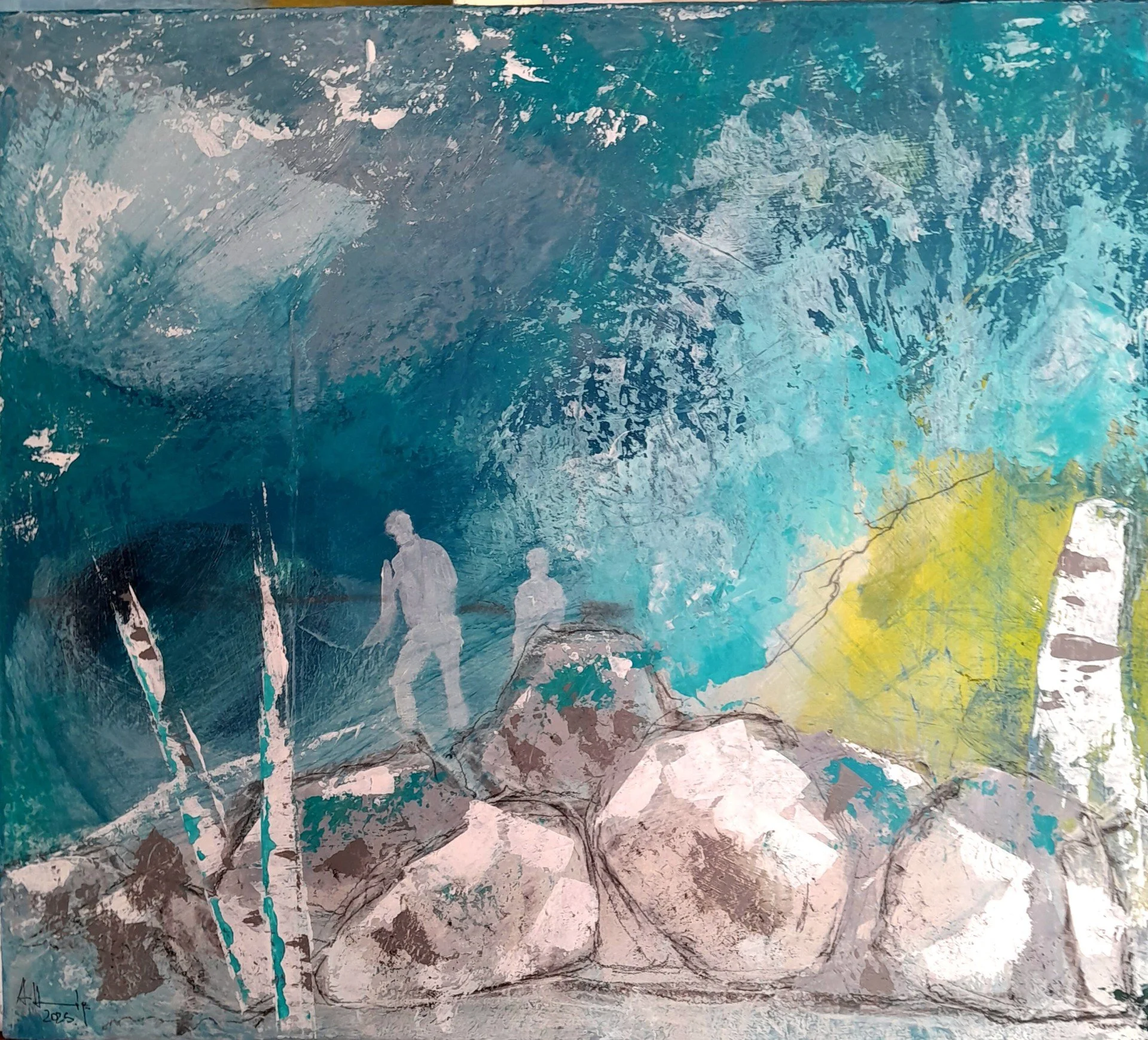 Acrylic, pastel, Indian Ink and charcoal on stretched canvas. Approx. 65x50cm